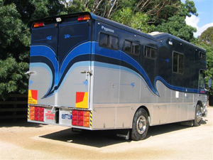 Electric and hydraulic loading ramps Video monitoring systems. Adjustable width stalls for horses with travelling problems. Interior feeders. Generous storage lockers with interior and exterior access. Roomy living spaces fitted to order with comfortable bunks and first rate kitchen facilities. Customized artwork and sign writing. Custom colours and striping