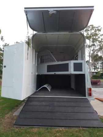 A frame filled with Checkerplate 4 wheel electric brakes Roller rocker suspension Break A Way system Tailgate 4'6" with gas struts Gaslift rear door Latch to hold gaslift rear door part open Padded dividers 480mm deep Divider near tailgate bent and hinged Double lined in head area Interior light Front tackbox with light and centre opening door Recessed door handles Rubber on walls and floor Side steps and rear steps Pop up vents x 2 in rear of float Large front window Sliding windows with fly screens 2 Lhs & 1 Rhs Swinging head dividers Dividers hinged for camping Rug rack over front window with door Wardrobe Checker plate kit to 800mm Rear removable 3 saddle box Extra 2 pop up vents in rear of float Mag Wheels