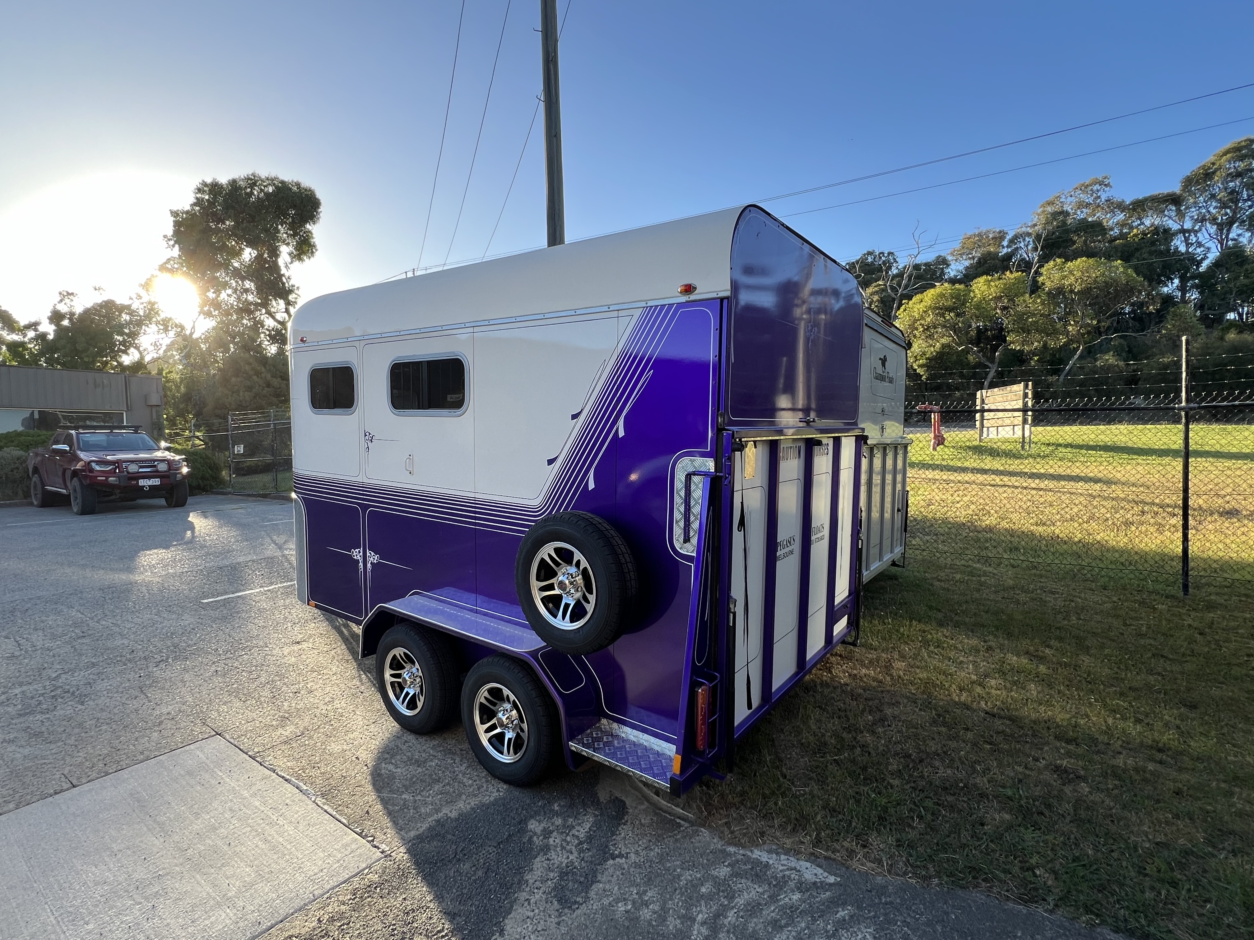 2018 Deluxe 2 Horse Angle Load Float 4 wheel electric brakes Breakaway system Interior light Head dividers fixed Padded dividers Rear divider bent and hinged 2 pop up vents Rear dust cover Slipper spring suspension Rubber on fllor and walls Large front window Sliding windows with flyscreens Gas stays on tailgate Spare tyre mounted