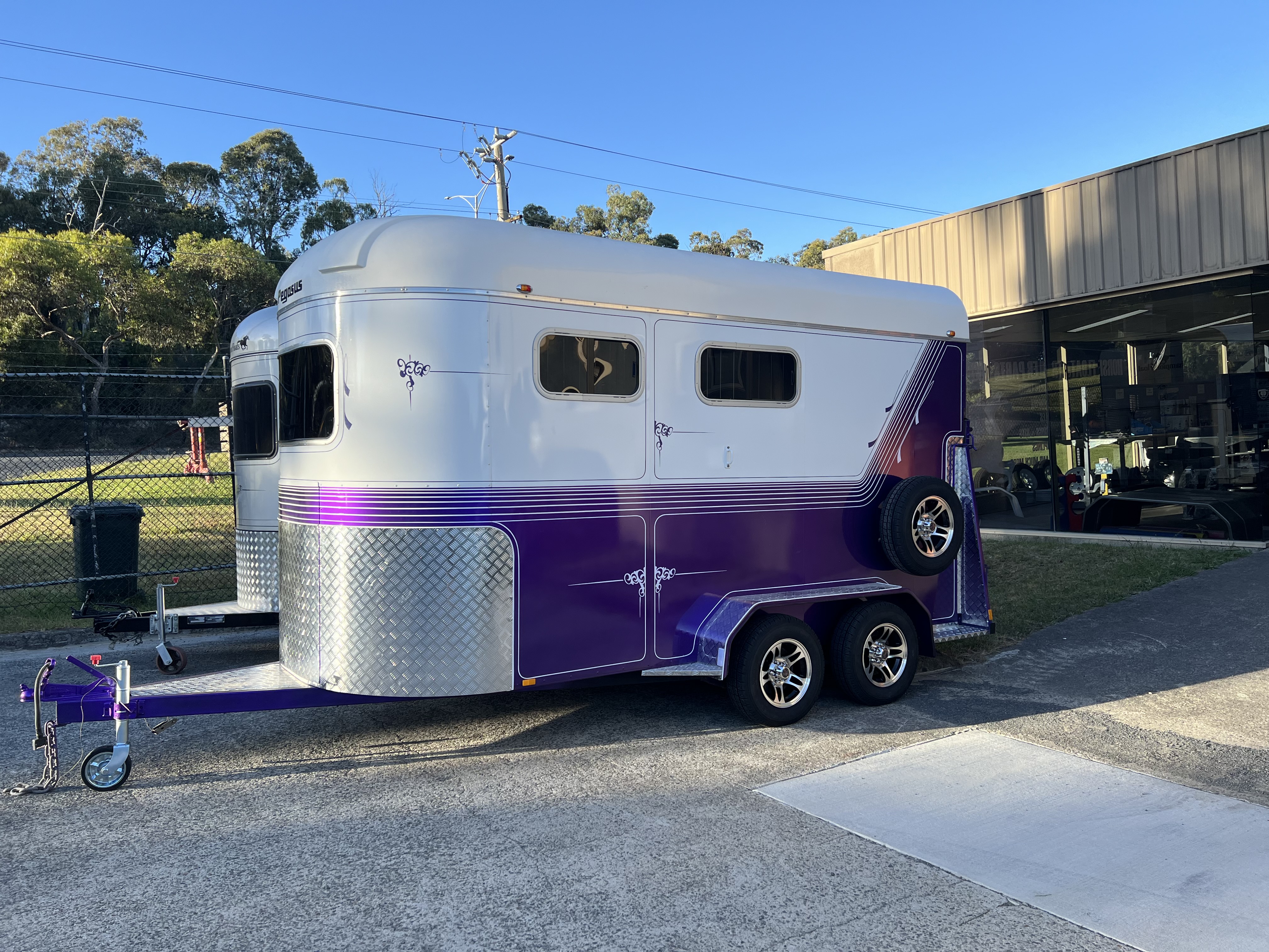 2018 Eventer 2 horse angle load float Extended 1 ft Large front tackbox with 2 tack doors Gas lift rear door Swinging head dividers Rug rack over front window with door Pop up vents Large front window Drop down feed windows 4 wheel electric brakes Breakaway system Roller rocker suspension Checkerplate kit to 800mm Recessed door handles Swingout tackbox - 3 saddle Gas stays on tackdoors & personal access door LED Internal light A frame filled with checkerplate Rubber on Walls and Floor